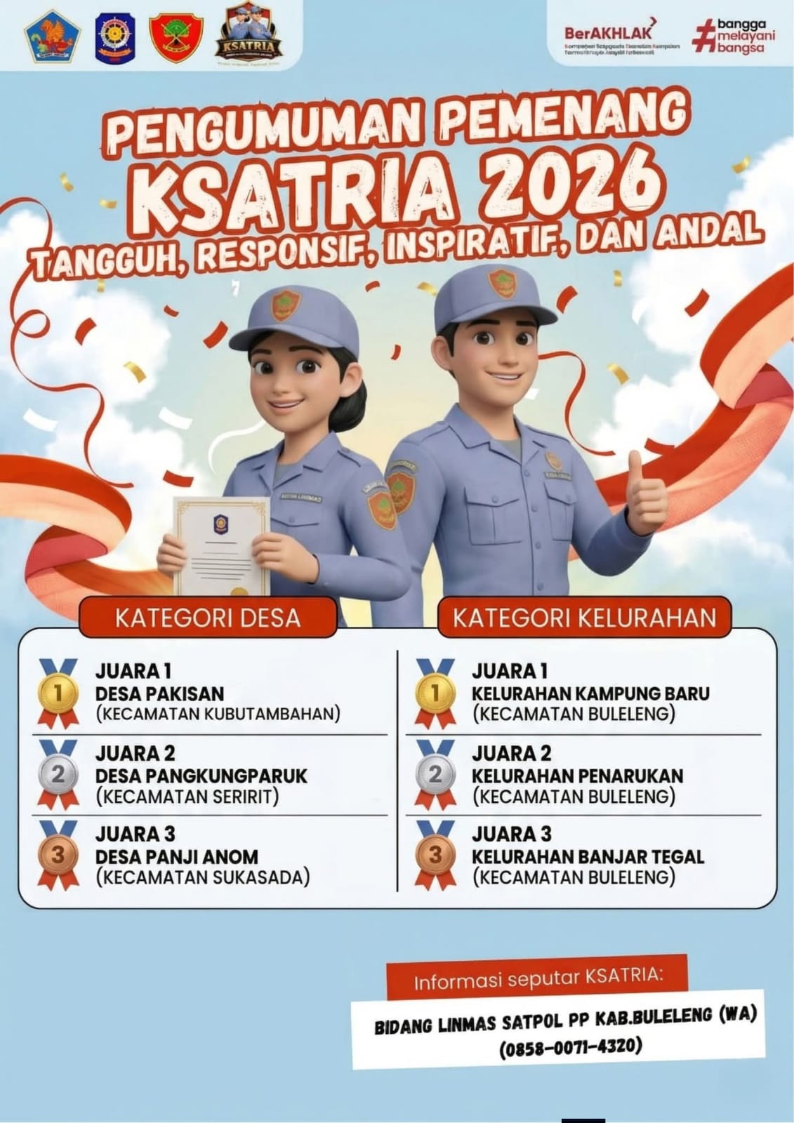 KAMPUNG BARU - Kemenangan bukanlah akhir, melainkan awal untuk melayani lebih baik. Setelah mengikuti serangkaian kompetisi yang penuh semangat, akhirnya KAMPUNG BARU terpilih sebagai Juara I dalam ajang KSATRIA 2026. Terima kasih SATLINMAS Kelurahan Kampung Baru sudah penuh semangat dalam berjuang sehingga sampai bisa menyisihkan beberapa Kelurahan sehingga mencapi puncak yang terbaik. Adapun rincian perolehan Juara adalah sebagai berikut :